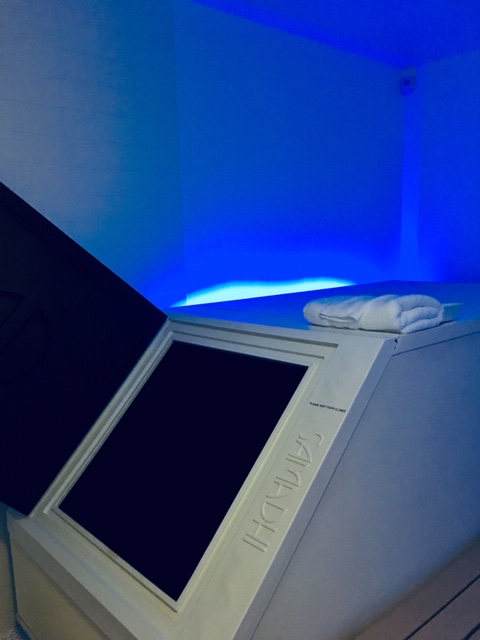 Each tank contains 10 inches of water and 850 pounds of Epsom salt — making the water denser than the Dead Sea and very buoyant. The saltwater is heated to something called “skin receptor neutral” or about 94.2 degrees, so it matches the floater’s skin temperature and there’s no real feeling of hot or cold.